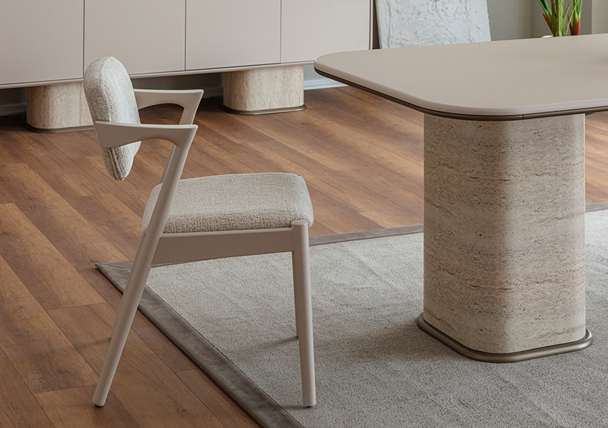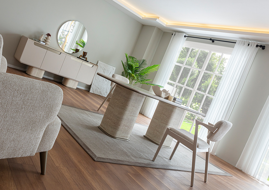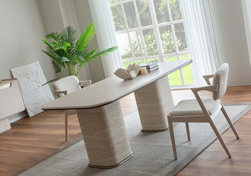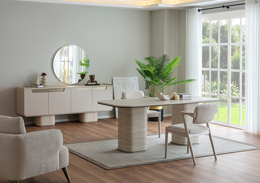 Pera Yemek Odası, modern çizgileri ve siyah-beyaz renkleriyle şık ve zarif bir oturma grubu sunar. Hem konforlu hem de estetik olan bu tasarım, çağdaş yaşam alanlarına mükemmel uyum sağlar.